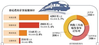 據(jù)交通部門預(yù)測,2018年春運期間進出京客流總量預(yù)計達4263萬人次,同比增長1.7%。其中,鐵路運輸旅客占比近七成,達2905萬人次,同比增長1.4%。此外,民航運輸旅客1148萬人次,同比增長3.8%;公路省際客運運輸旅客210萬人次,同比減少6%。