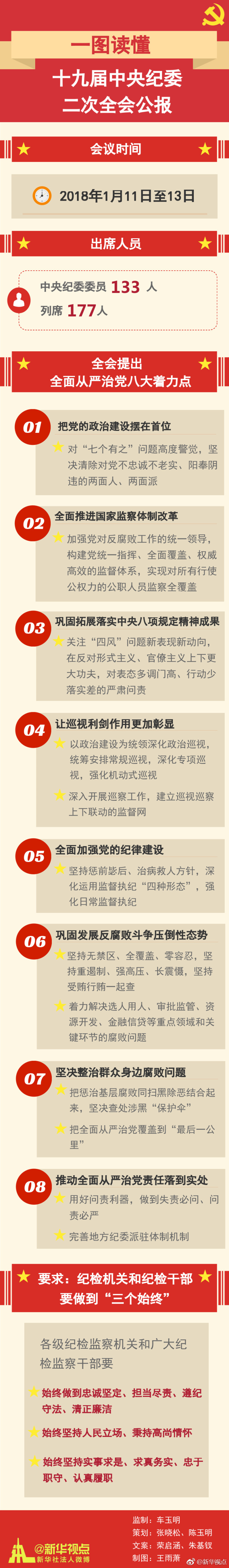 新華網(wǎng)北京1月13日電 13日審議通過的十九屆中央紀(jì)委二次全會公報新鮮出爐。想知道全面從嚴(yán)治黨如何發(fā)力?有這張圖在手,重點、亮點、焦點你都擁有?。〒?jù)“新華視點”微博報道)