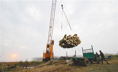 2017年11月27日,南洞庭湖自然保護(hù)區(qū)核心區(qū)內(nèi),機械吊臂將被清理的歐美黑楊運上貨車?!⌒氯A社記者 李 尕攝