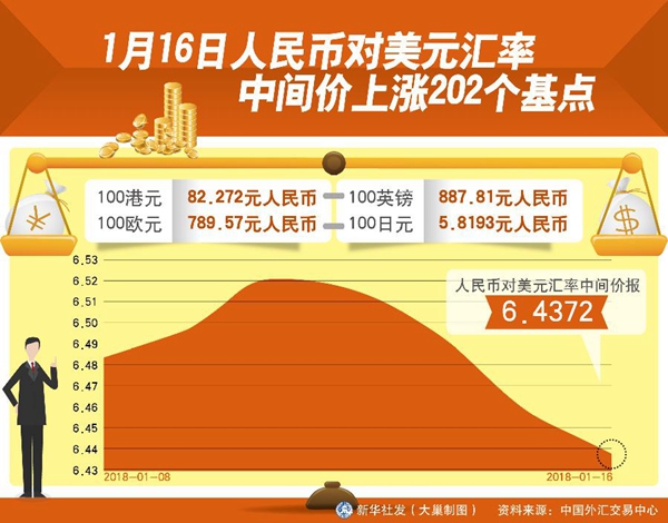 ??? 17日,人民幣對美元中間價報6.4335,創(chuàng)2015年12月10日以來新高。對越來越多走出國門的中國人來說,人民幣值不值錢很重要。記者算了一筆賬,以17日當天的人民幣對美元中間價計算,與去年同期比,1萬元人民幣能多換近105美元。一些計劃春節(jié)出游或有留學需求的人們甚至加快了換匯步伐。>>