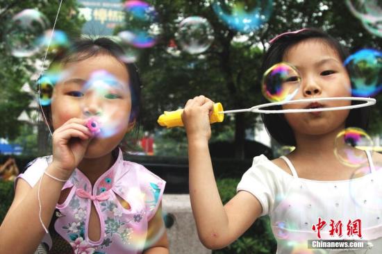 圖為兩名小女孩在南昌八一廣場(chǎng)上吹泡泡(資料圖)。中新社發(fā) 劉占昆 攝