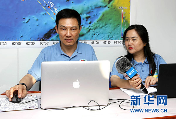 1月25日,中巴首次北印度洋聯(lián)合考察首席科學(xué)家林間(左)在“實(shí)驗(yàn)3”號(hào)科考船上進(jìn)行“海上科普”直播。新華社發(fā)