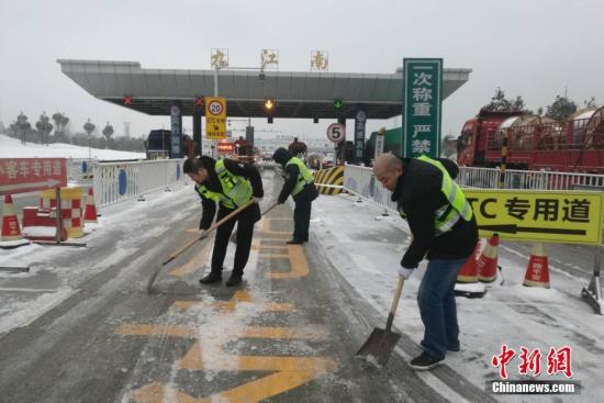 資料圖:江西高速公路工作人員在收費(fèi)站通道進(jìn)行掃雪除冰作業(yè)。鐘欣 攝