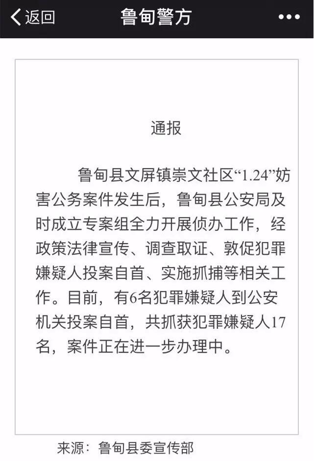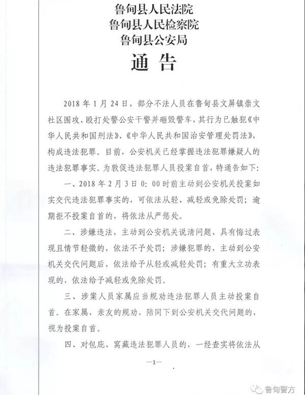 與此同時(shí),魯?shù)榭h公安局、法院、檢察院聯(lián)合發(fā)出通告稱,部分不法人員在魯?shù)榭h文屏鎮(zhèn)崇文社區(qū)圍攻、毆打處警公安干警并砸毀警車(chē),其行為已觸犯《中華人民共和國(guó)刑法》、《中華人民共和國(guó)治安管理處罰法》,構(gòu)成違法犯罪,公安機(jī)關(guān)已經(jīng)掌握違法犯罪嫌疑人的違法犯罪事實(shí),限期在2月3日凌晨0點(diǎn)前主動(dòng)到公安機(jī)關(guān)投案自首、交代違法犯罪事實(shí),可依法從輕、減輕或免除處罰,逾期拒不投案自首的,將依法嚴(yán)懲。