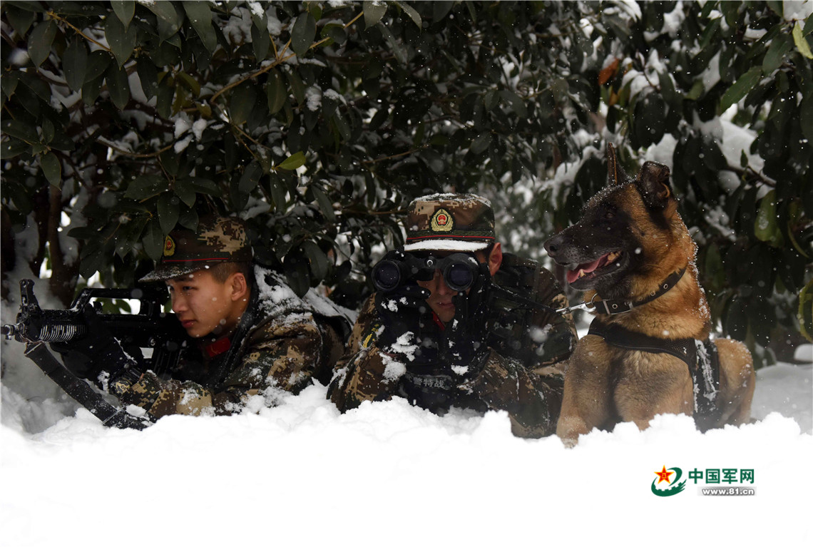 1月27日,武警安徽總隊機動支隊警犬班班長王營廣帶領(lǐng)警犬“魯克”進(jìn)行隱蔽偵察訓(xùn)練。