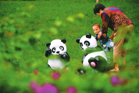 2月3日,冬日的陽(yáng)光明艷無(wú)比,成都三環(huán)路嬌子立交至航天立交外側(cè),濃密的樹(shù)叢里,一條灰磚小道在草地里蜿蜒。周?chē)⒙涞氖歉鞣N熊貓的雕塑,有彩色的,也有用植物打造的。