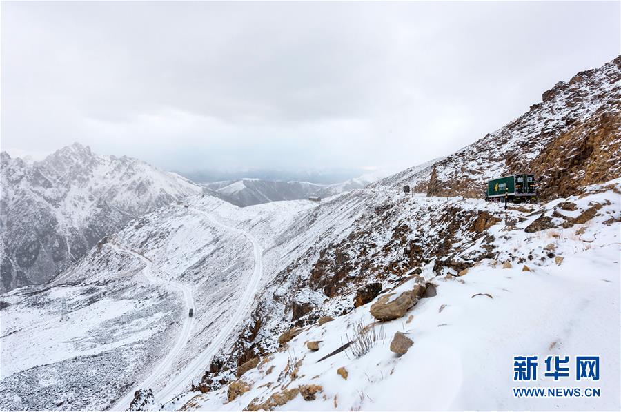 其美多吉與同事駕車行駛在雪線郵路上(資料照片)。新華社發(fā)(周兵 攝)