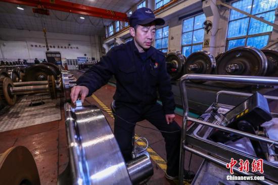 資料圖:列車“修腳師在對(duì)列車車輪進(jìn)行探傷檢查。中新社記者 張暢 攝