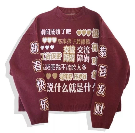 所謂鎧甲,其實(shí)是一件自帶吐槽氣質(zhì)的衛(wèi)衣,兩條袖子上分別印著“新春快樂(lè)”“恭喜發(fā)財(cái)”,仿佛大門兩側(cè)貼著喜慶的春聯(lián)。然而“推門”進(jìn)去,衛(wèi)衣正面沖出一大片冷冰冰的“彈幕”:“別問(wèn)成績(jī)了吧”“工資保密”“交流障礙”“沒(méi)有對(duì)象”“您家孩子最棒棒”……