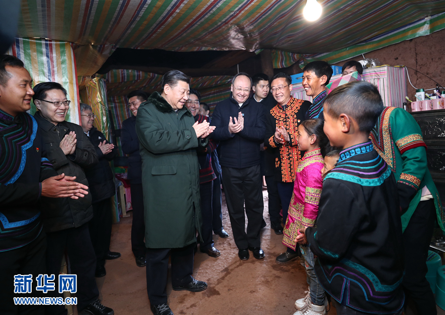 這是2月11日上午,習(xí)近平在涼山彝族自治州昭覺(jué)縣三岔河鄉(xiāng)三河村貧困戶吉好也求家中看望,聽10歲小女孩吉好有果唱《國(guó)旗國(guó)旗真美麗》。新華社記者 鞠鵬 攝