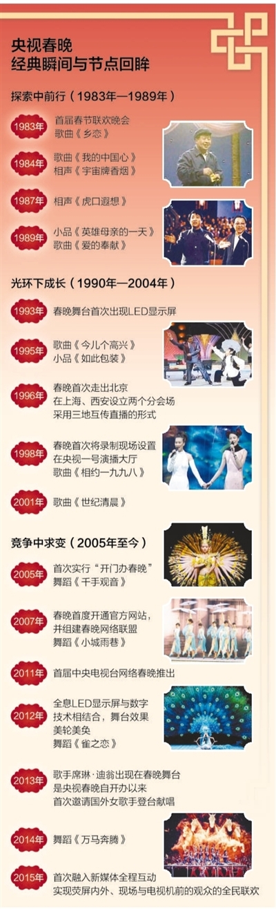 春晚的自我更新還體現(xiàn)在與不同時(shí)代的新興媒體展開(kāi)合作。如八九十年代的電話熱線,90年代末期興起短信投票,以及新世紀(jì)以來(lái)與微博、支付寶、微信的合作。正是這種在表演形式、舞臺(tái)風(fēng)格上既保持固有特色,又不斷求新求變的創(chuàng)新精神,使得春晚成為每年最受關(guān)注的綜藝大餐。