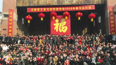 近四米見方的大紅“福”字懸掛在舞臺中央,上面是寫有“河順鎮(zhèn)王家溝居民委員會2018年春節(jié)全村福”的大紅條幅。這樣喜慶的背景下面,是700多人笑逐顏開的臉。2月16日,大年初一,河南林州河順鎮(zhèn)王家溝村村民們拍了全村有史以來的第一張全村福。