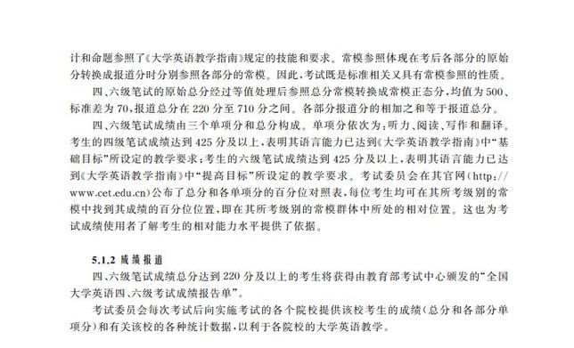 中國青年報(bào)(ID:zqbcyol)注意到,《全國大學(xué)生英語四、六級(jí)考試大綱》(2016修訂版)顯示,“考生的四級(jí)筆試成績(jī)達(dá)到425分及以上,表明其語言能力已達(dá)到《大學(xué)英語教學(xué)指南》中‘基礎(chǔ)目標(biāo)’所設(shè)定的教學(xué)要求;考生的六級(jí)筆試成績(jī)達(dá)到425分及以上,表明其語言能力已達(dá)到《大學(xué)英語教學(xué)指南》中‘提高目標(biāo)’所設(shè)定的教學(xué)要求?!?/p>