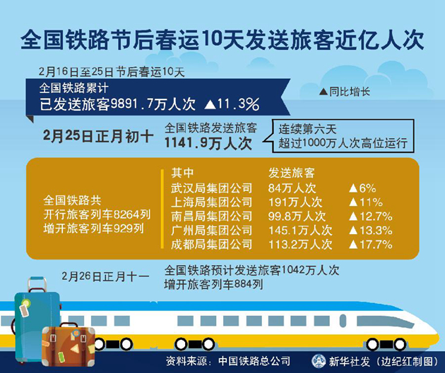 2月26日,全國鐵路發(fā)送旅客1084萬人次,客流略有回落但仍保持高位運(yùn)行,已連續(xù)七天超過1000萬人次;春運(yùn)同比增加145.5萬人次,增長15.5%,為今年春運(yùn)以來同比增幅最大的一天。全國鐵路共開行旅客列車8155列,增開旅客列車884列。武漢局集團(tuán)公司當(dāng)日發(fā)送旅客78.3萬人次,同比增長8.5%;上海局集團(tuán)公司發(fā)送旅客185.6萬人次,同比增長15.2%;南昌局集團(tuán)公司發(fā)送旅客92.5萬人次,同比增長12.7%;廣州局集團(tuán)公司發(fā)送旅客137.5萬人次,同比增長16.8%;成都局集團(tuán)公司發(fā)送旅客108.6萬人次,同比增長18.8%。