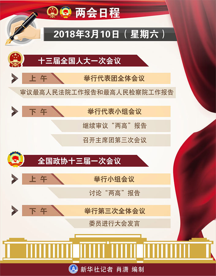 新華社北京3月9日電 十三屆全國人大一次會議10日上午舉行代表團(tuán)全體會議,審議最高人民法院工作報告和最高人民檢察院工作報告。下午舉行代表小組會議,繼續(xù)審議“兩高”報告,召開主席團(tuán)第三次會議。