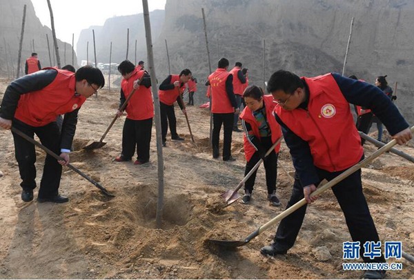 3月12日,山西省運(yùn)城市稷山縣學(xué)雷鋒志愿者協(xié)會(huì)的志愿者們?cè)诨纳骄G化點(diǎn)義務(wù)植樹(shù)。 新華社發(fā)(栗盧建 攝)