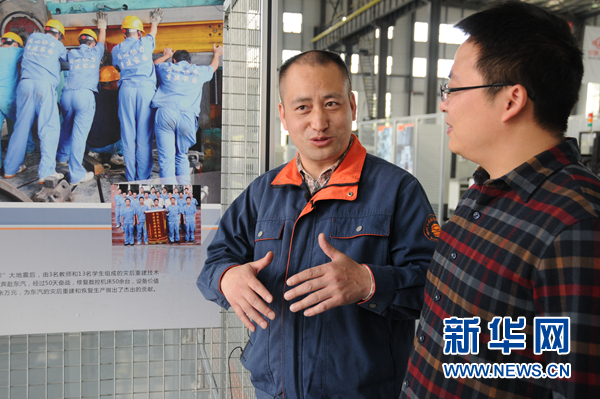 胡明華(左)與團(tuán)隊成員一起向記者回憶2008年他們援助東汽災(zāi)后重建工作的情形。新華網(wǎng) 聶晨靜 攝