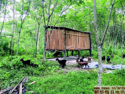 王成安在扶貧干部黃海軍的幫扶下,精準選擇養(yǎng)殖市場穩(wěn)定的本地黑山羊,他在橡膠林建起了一座高腳羊舍,已賣了一批羊。劉鄧 攝