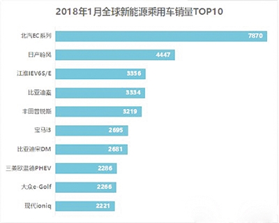 2018年1月全球新能源乘用車銷量超過8.2萬臺,其中中國新能源乘用車銷量達到了3.2萬臺,占比38.57%。從2018年1月全球新能源乘用車銷量排名來看,奪得冠軍的是自主品牌車型北汽EC系列,銷售了7870臺;排在第二位的是日產聆風,銷售了4447臺;緊隨其后的是江淮IEV6S/E,銷售了3356臺。除此之外,進入TOP10的自主品牌車型還有比亞迪秦和比亞迪宋DM。(來源:電動汽車資源網)