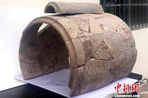 資料圖:2017年,考古人員在位于西安的櫟陽遺址發(fā)現(xiàn)一件戰(zhàn)國時(shí)期的筒瓦,被確認(rèn)為目前中國已知體量最大的古代筒瓦。圖為出土的巨型筒瓦和普通陶瓦。阿房宮與上林苑考古隊(duì)供圖