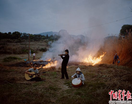 3月14日傍晚,福建省福州市閩侯縣關(guān)中村,“南部生活”共識(shí)社區(qū)成員在墾荒前將蘆葦和野草燒掉,日本建筑師吉富遙樹(shù)、社區(qū)發(fā)起人唐冠華和邢振(左至右)見(jiàn)到燒荒的場(chǎng)景,臨時(shí)起意來(lái)到現(xiàn)場(chǎng)演奏。