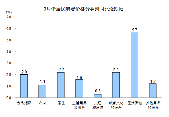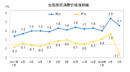 2018年3月份,全國居民消費價格同比上漲2.1%。其中,城市上漲2.1%,農(nóng)村上漲1.9%;食品價格上漲2.1%,非食品價格上漲2.1%;消費品價格上漲1.6%,服務(wù)價格上漲2.8%。一季度,全國居民消費價格總水平比去年同期上漲2.1%。