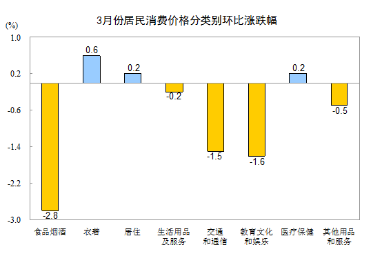 3月份,全國居民消費價格環(huán)比下降1.1%。其中,城市下降1.1%,農(nóng)村下降1.2%;食品價格下降4.2%,非食品價格下降0.4%;消費品價格下降1.4%,服務(wù)價格下降0.7%。