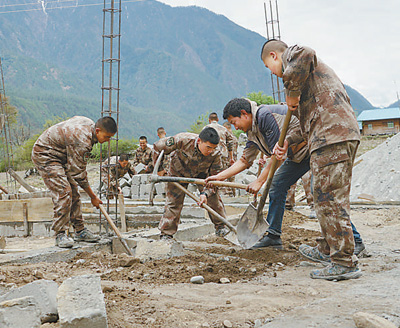 上察隅鎮(zhèn)松林村藏族同胞玖五家建房缺幫手,邊防官兵主動前往幫忙。 記者 鄧建勝攝