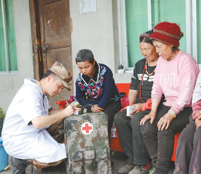 邊境村遠離城鎮(zhèn),邊防官兵每月都要組織衛(wèi)生員到村里巡診。圖為4月10日,連隊醫(yī)生陽運川來到次旺卓瑪(戴項鏈者)家義診。 記者 鄧建勝攝