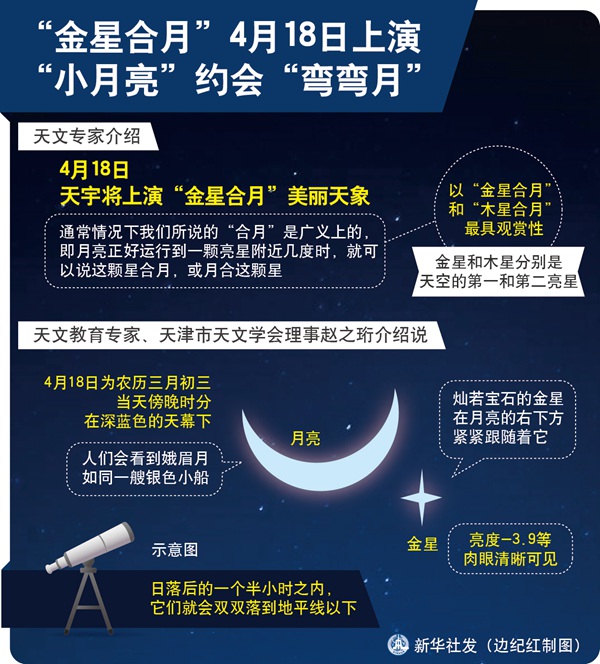 新華社天津4月16日電(記者 周潤(rùn)?。┨煳膶?zhuān)家介紹,4月18日天宇將上演“金星合月”美麗天象,在天氣晴朗的條件下,公眾可一睹有著“維納斯”之稱(chēng)的金星與一彎娥眉月相依相伴的迷人場(chǎng)景。