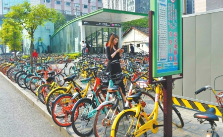 部分路段超量投放 單車(chē)被“疊”放成上下兩排