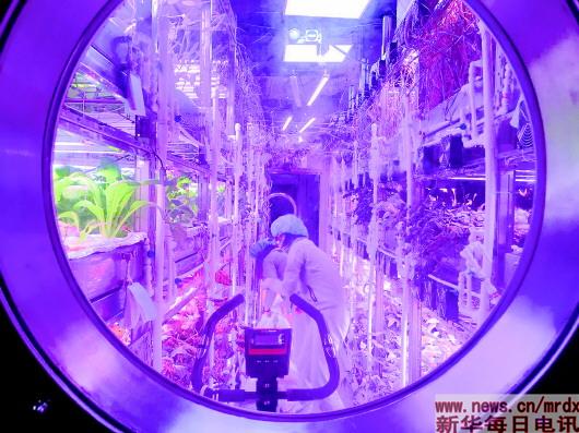 經(jīng)過二期升級(jí),現(xiàn)在的“月宮一號(hào)”由一個(gè)綜合艙和兩個(gè)植物艙組成,綜合艙面積42平方米,是集客廳、工作間、廚房、餐廳多功能一體的交流間;每個(gè)植物艙面積約50平方米,實(shí)驗(yàn)員把這里當(dāng)做一個(gè)“開心農(nóng)場(chǎng)”,“農(nóng)場(chǎng)”里種著小麥、大豆、玉米等糧食作物,還有胡蘿卜、黃瓜、生菜等蔬菜作物,種植作物共計(jì)35種,他們分批次播種,每天都能感受豐收的喜悅。