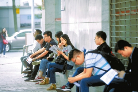4月21日,在四川省公招公務(wù)員考點(diǎn)外,應(yīng)考者正在抓緊時(shí)間復(fù)習(xí)備考。