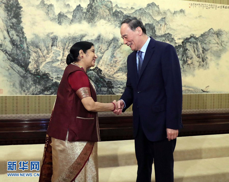 4月23日,國(guó)家副主席王岐山在北京中南海會(huì)見(jiàn)印度外長(zhǎng)斯瓦拉杰。新華社記者劉衛(wèi)兵攝