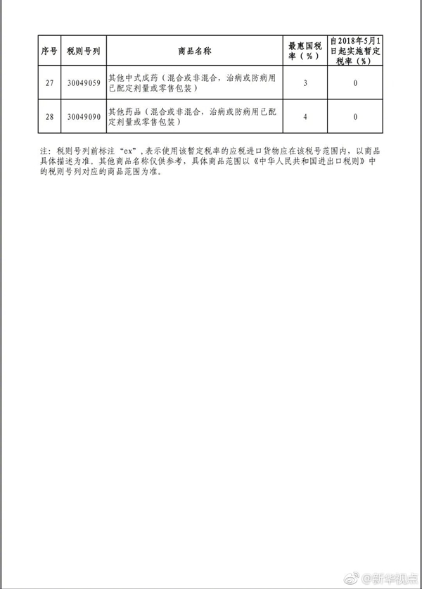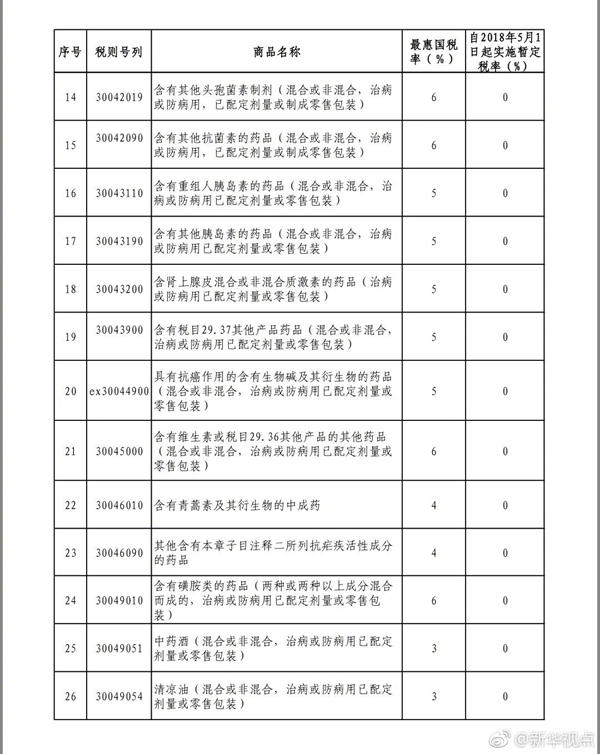 新華網(wǎng)北京4月23日電 財(cái)政部關(guān)稅司23日發(fā)布消息,5月1日起我國將取消包括抗癌藥在內(nèi)的28項(xiàng)藥品進(jìn)口關(guān)稅。調(diào)整后,除安宮牛黃丸等我國特產(chǎn)藥品、部分生物堿類藥品等少數(shù)品種外,絕大多數(shù)進(jìn)口藥品,特別是有實(shí)際進(jìn)口的抗癌藥均將實(shí)現(xiàn)零關(guān)稅。(記者郁瓊源) ????(據(jù)新華社“新華視點(diǎn)”微博報(bào)道)?
