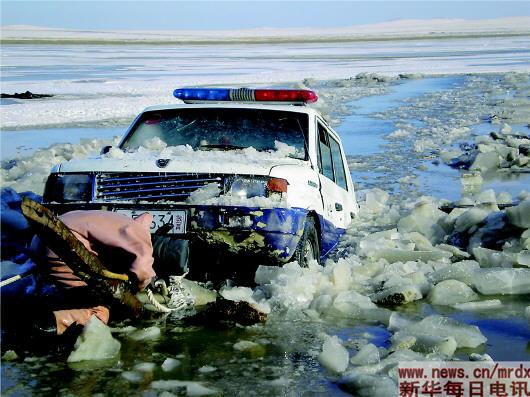 ▲2006年11月13日,達(dá)賚湖公安分局執(zhí)勤車輛在冰面上遇險(xiǎn)?!∈茉L者供圖