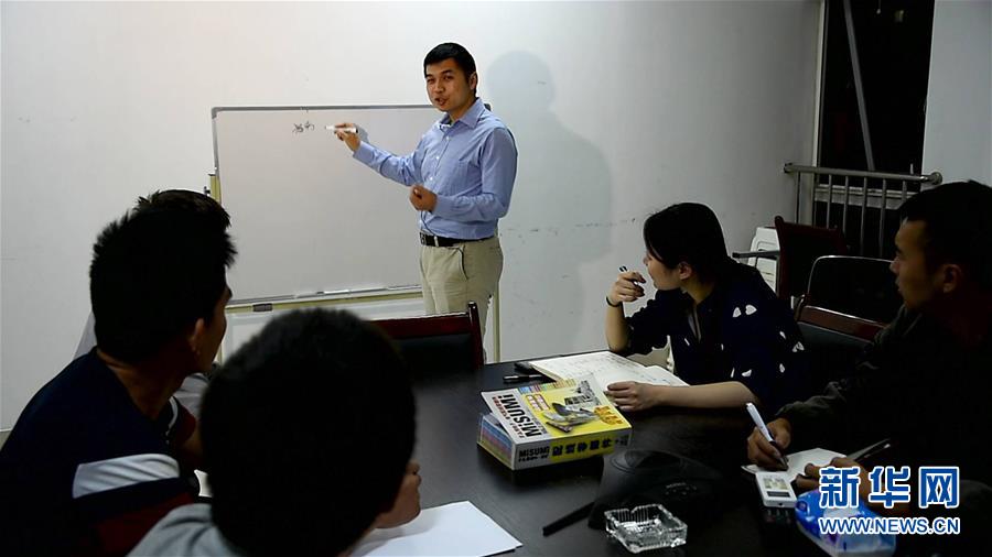 濟南翼菲自動化科技有限公司創(chuàng)始人張賽與同事們開會(2017年9月25日攝)。新華社發(fā)