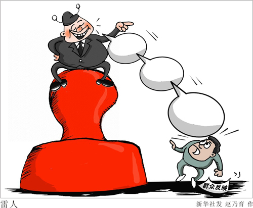 其二,遮丑關。“家丑不可外揚”思維作祟,怕違法亂紀行為曝光影響地方形象而護短、包庇。在不少侵害群眾利益的行為中,一些政府部門或多或少充當了幫兇。只要群眾忍氣吞聲,這些行為就不了了之。一旦群眾投訴引發(fā)輿論關注,當?shù)卣ε缕毓庥绊懙胤叫蜗笊踔痢盀跫喢薄?,就派出各路人馬“游說”。這些干部接待上訪群眾時先表示同情和理解,再以“大局意識”進行說教,最終提出賠錢了事。一旦“說不通”,就“放狠話”“玩拖延”,甚至威脅。
