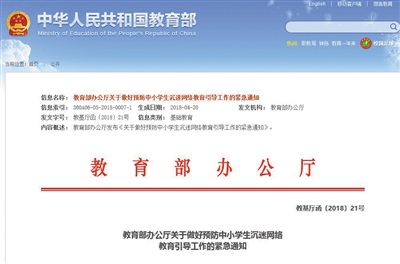 4月20日,教育部官網(wǎng)發(fā)布《關(guān)于做好預防中小學生沉迷網(wǎng)絡(luò)教育引導工作的緊急通知》,其中提及,“隨著互聯(lián)網(wǎng)和手機終端發(fā)展,成癮性網(wǎng)絡(luò)游戲、邪惡動漫、不良小說、互聯(lián)網(wǎng)賭博等不斷出現(xiàn),造成一些中小學生沉迷游戲、行為失范、價值觀混亂等問題,嚴重影響了中小學生的學習進步和身心健康,甚至出現(xiàn)人身傷亡、違法犯罪等惡性事件。”