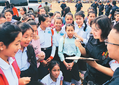 4月26日,在老撾南塔省勐龍縣班相果中學(xué),云南省公安邊防總隊(duì)醫(yī)院工作人員正在和學(xué)生交流。張敏 攝