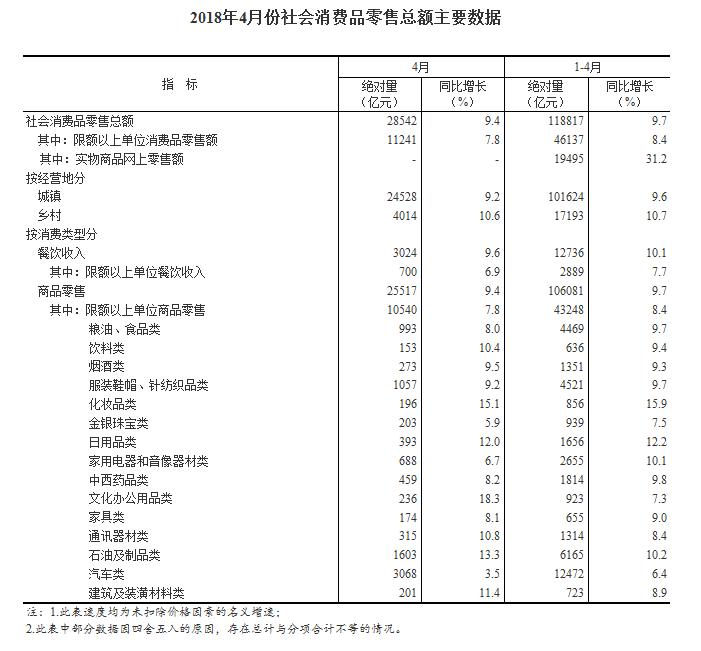 據(jù)國家統(tǒng)計(jì)局網(wǎng)站消息,2018年4月份,社會(huì)消費(fèi)品零售總額28542億元,同比名義增長9.4%(扣除價(jià)格因素實(shí)際增長7.9%,以下除特殊說明外均為名義增長)。其中,限額以上單位消費(fèi)品零售額11241億元,增長7.8%。