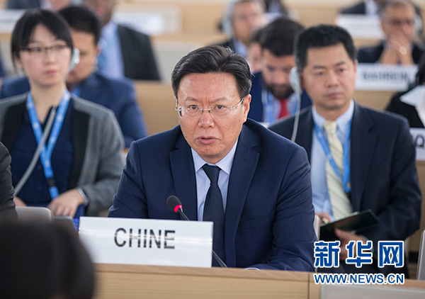 5月18日,在瑞士日內(nèi)瓦萬(wàn)國(guó)宮,中國(guó)常駐聯(lián)合國(guó)日內(nèi)瓦辦事處和瑞士其他國(guó)際組織代表俞建華(中)出席聯(lián)合國(guó)人權(quán)理事會(huì)加沙局勢(shì)特別會(huì)議。新華社記者 徐金泉 攝