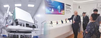 圖左為維信諾(固安)第六代全柔AMOLED生產(chǎn)線智能車間,圖右為維信諾總裁張德強博士(左一)介紹柔性屏產(chǎn)品終端應用。資料圖片 制圖:張丹峰
