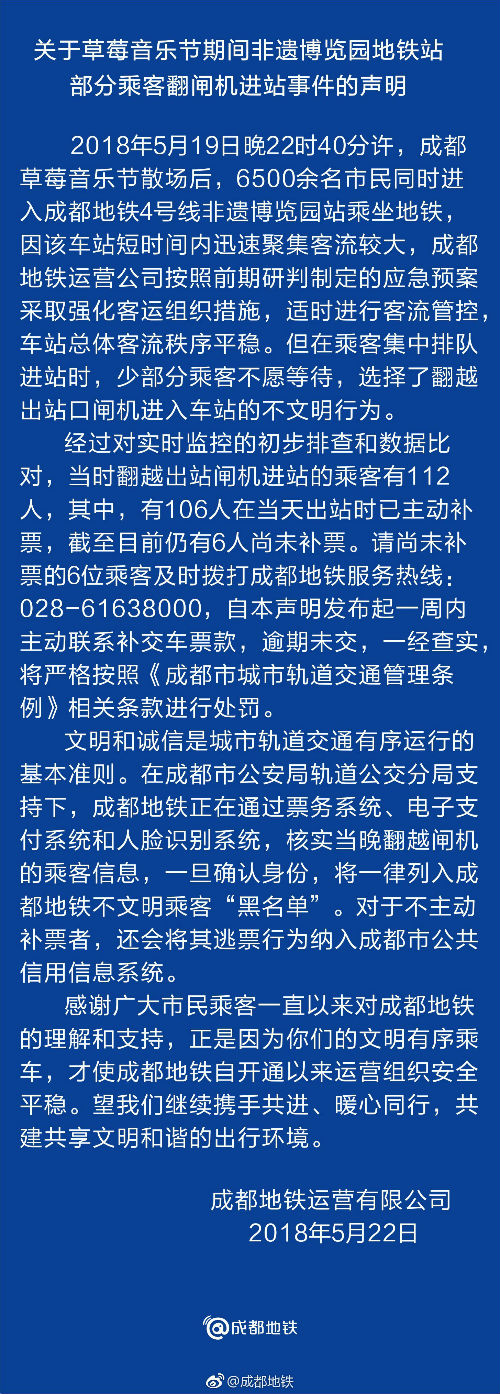 5月22日,成都地鐵發(fā)布“關(guān)于草莓音樂(lè)節(jié)期間非遺博覽園地鐵站部分乘客翻閘機(jī)進(jìn)站事件的聲明”(以下簡(jiǎn)稱(chēng)“聲明”),稱(chēng),5月19日晚草莓音樂(lè)節(jié)散場(chǎng)后翻越地鐵4號(hào)線非遺博覽園站出站閘機(jī)進(jìn)站的乘客112人中,尚有6人尚未補(bǔ)票?!奥暶鳌卑l(fā)布起一周內(nèi),希望他們主動(dòng)聯(lián)系補(bǔ)交車(chē)票款,逾期未交,一經(jīng)查實(shí),將嚴(yán)格按照《成都市城市軌道交通管理?xiàng)l例》相關(guān)條款進(jìn)行處罰。