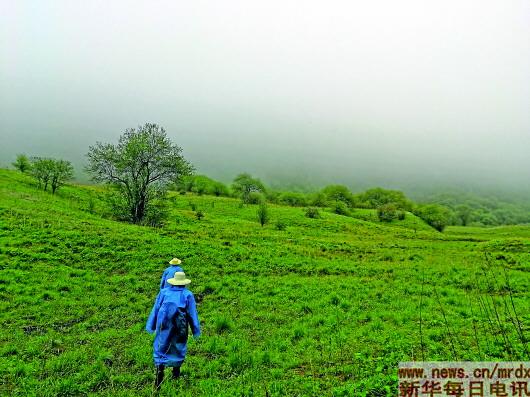 記者依依不舍地告別珙桐,又攀行一小時許,終于抵達(dá)海拔2200米左右的山頂“黃竹埡”。登高遠(yuǎn)眺,山的另一側(cè)呈現(xiàn)出截然不同的景象:一望無際的草叢鋪就連綿起伏的綠毯,散落的樹林在雨霧中勾勒出神秘而美麗的輪廓。