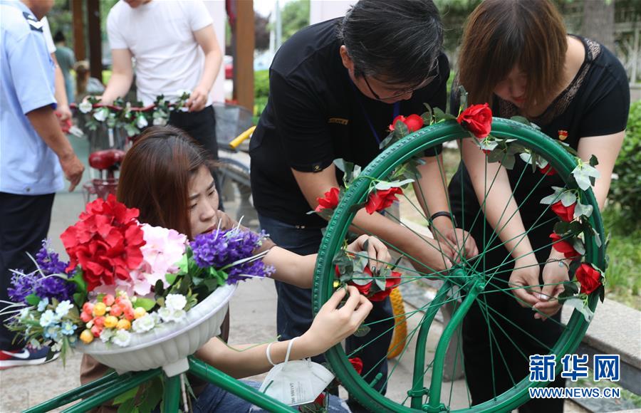 6月9日,豐臺區(qū)花鄉(xiāng)天倫錦城社區(qū)居民們在裝飾廢舊自行車。