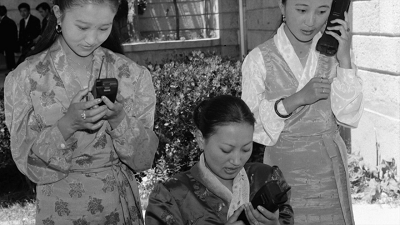 1993年8月14日西藏拉薩正式開通“大哥大”成了新聞頭條(新華社記者 范長國攝),而2018年5月2日,在珠穆朗瑪峰旅游大本營一家?guī)づ衤灭^內(nèi),游客用手機上網(wǎng)已是司空見慣(新華社記者 黃浩銘 攝)。
