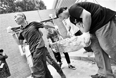在昨天的文物搬運(yùn)現(xiàn)場(chǎng),兩位工人挑擔(dān)子,兩位工人用手托住龍頭兩邊,四人費(fèi)了好大勁才將螭頭搬到車(chē)上,開(kāi)啟“回家”之路。待螭頭到達(dá)圓明園后,將有專(zhuān)家對(duì)它們進(jìn)行全身“體檢”,制定修復(fù)方案。“這些螭頭有一些小裂縫,如果不好好保護(hù),時(shí)間久了容易出問(wèn)題?!眻A明園文物考古科科長(zhǎng)陳輝說(shuō)。(記者 李夢(mèng)婷)