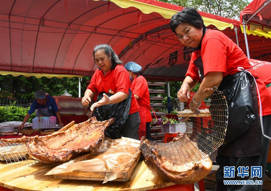 6月14日,工作人員在廣州天河區(qū)珠村七夕廣場準備龍舟飯。當日,廣州市天河區(qū)舉行一場熱鬧歡快的龍舟活動,來自多個村莊“走親戚”的龍舟隊參加。按廣州的傳統(tǒng)習俗,每年農歷五月初一至初五,各村的龍舟隊要到周圍村落“走親戚”。走親戚的龍舟隊到來時,受訪村子要準備好龍舟飯招待來客。活動當天,鳴炮敲鑼,一派喜慶氣氛。新華社記者 鄧華 攝
