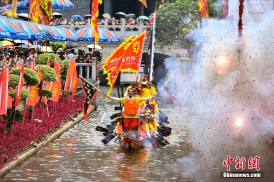 6月18日,廣州獵德村舉行端午龍舟勝景活動(dòng),吸引了大批民眾駐足觀看。中新社記者 陳驥旻 攝